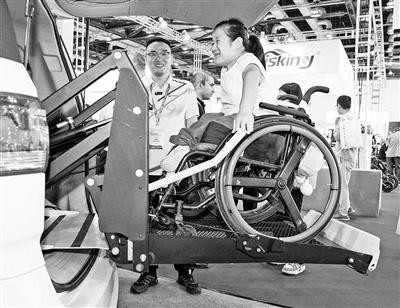 参观者在中国国际康复博览会上体验尾门式升降机。新华社记者才扬摄